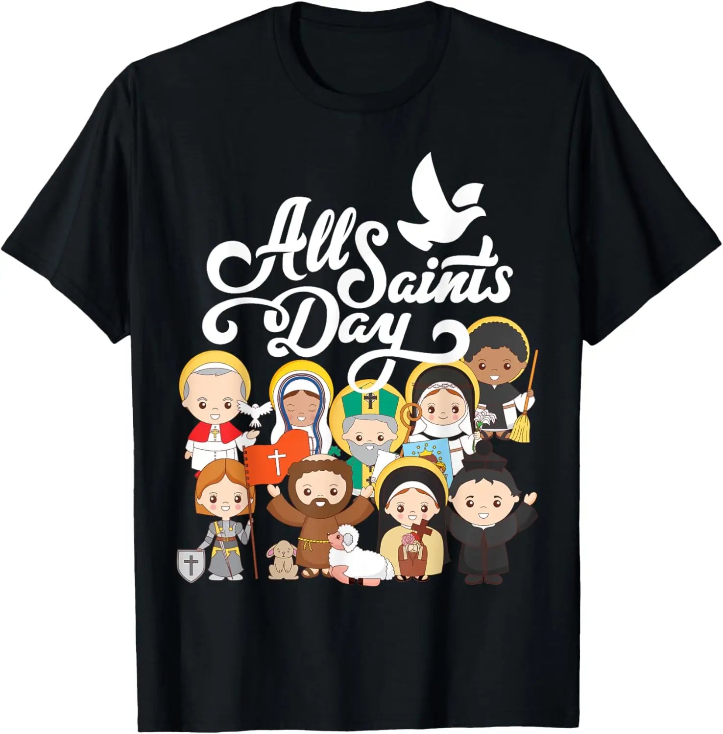 The perfect design for Catholic kids young and old for All Saints Day, featuring St Francis of Assisi, St Therese of Lisieux, St Joan of Arc, Saint John Bosco, Saint Patrick, St Martin de Porres, St Catherine of Siena, and more.